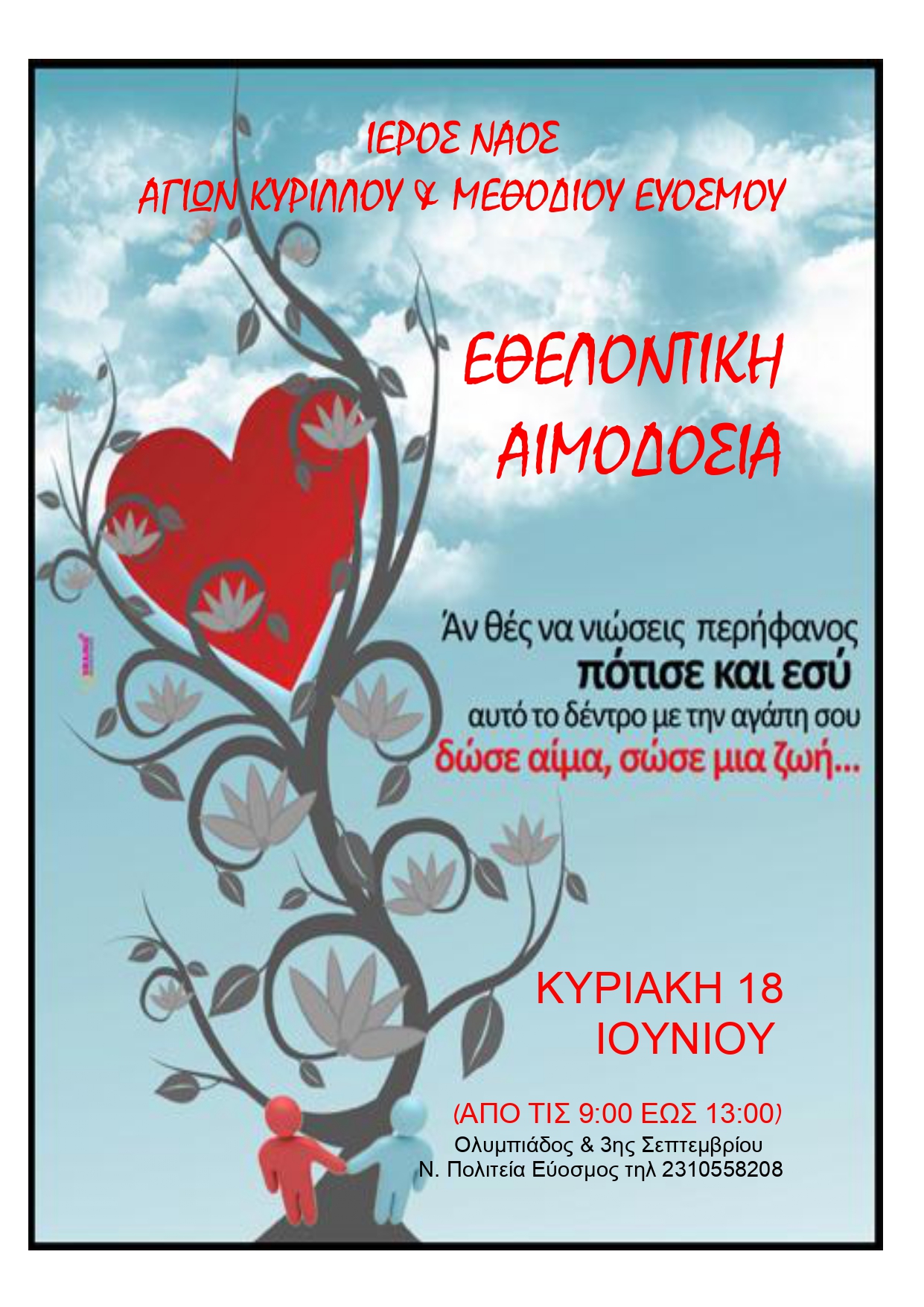 Αιμοδοσία θα διενεργηθεί στον Ι.Ν.Αγίων Κυρίλλου και Μεθοδίου Νεαπόλεως, την Κυριακή 18 Ιουνίου 2023, σύμφωνα με το Πρόγραμμα: