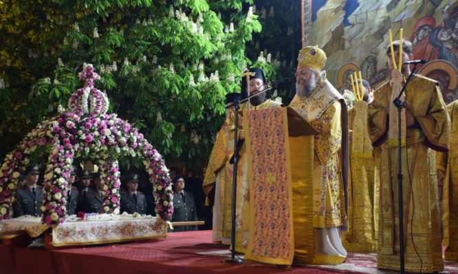Μετά το ψάλσιμο των Εγκωμίων και των Αναστάσιμων Ευλογηταρίων που έψαλλαν εναλλάξ η χορωδία των Ιεροψαλτών και οι Ιερείς με επικεφαλής τον Σεβασμιώτατο Ποιμενάρχη μας, ακολούθησε η περιφορά του Επιταφίου, όπου μέσα σε κατανυκτική ατμόσφαιρα με την συνοδεία τιμητικού αγήματος του στρατού με τα όπλα σε στάση υπό μάλης και τις πένθιμες μελωδίες της φιλαρμονικής μπάντας του Δήμου Τρικκαίων, πραγματοποιήθηκε στην κεντρική πλατεία της πόλεως η συνάντηση των Επιταφίων των ενοριών της πόλεως των Τρικάλων, η οποία ήταν στολισμένη και κυριολεκτικά κατεκλύσθη από τον πολλή κόσμο προς τον οποίον ο σεπτός Μητροπολίτης μας απηύθυνε λόγους αγάπης, πατρικές ευχές και ευλογίες.