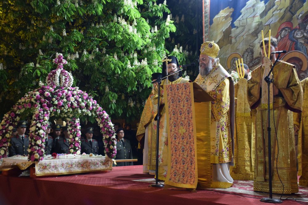 Μετά το ψάλσιμο των Εγκωμίων και των Αναστάσιμων Ευλογηταρίων που έψαλλαν εναλλάξ η χορωδία των Ιεροψαλτών και οι Ιερείς με επικεφαλής τον Σεβασμιώτατο Ποιμενάρχη μας, ακολούθησε η περιφορά του Επιταφίου, όπου μέσα σε κατανυκτική ατμόσφαιρα με την συνοδεία τιμητικού αγήματος του στρατού με τα όπλα σε στάση υπό μάλης και τις πένθιμες μελωδίες της φιλαρμονικής μπάντας του Δήμου Τρικκαίων, πραγματοποιήθηκε στην κεντρική πλατεία της πόλεως η συνάντηση των Επιταφίων των ενοριών της πόλεως των Τρικάλων, η οποία ήταν στολισμένη και κυριολεκτικά κατεκλύσθη από τον πολλή κόσμο προς τον οποίον ο σεπτός Μητροπολίτης μας απηύθυνε λόγους αγάπης, πατρικές ευχές και ευλογίες.