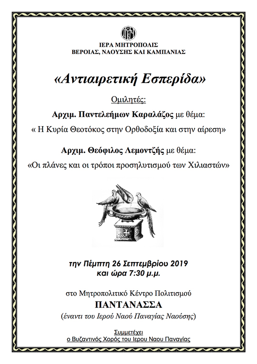Αντιαιρετική εσπερίδα διοργανώνει η Μητρόπολη Βεροίας την προσεχή Πέμπτη (26/9) στη Νάουσα.