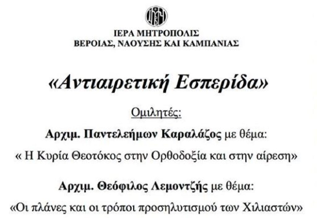 Στην αντιαιρετική εσπερίδα, θα ομιλήσουν ο Αρχιμ. Παντελεήμων Καραλάζος με θέμα: «Η Κυρία Θεοτόκος στην Ορθοδοξία και στην αίρεση» και ο Αρχιμ. Θεόφιλος Λεμοντζής με θέμα: «Οι πλάνες και οι τρόποι προσηλυτισμού των Χιλιαστών». Θα συμμετέχει ο Βυζαντινός Χορός του Ιερού Ναού