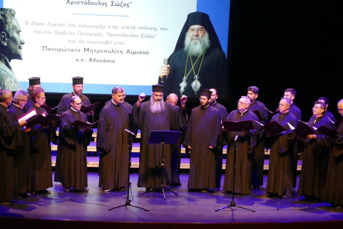 Στο κατάμεστο Παττίχειο Δημοτικό Θέατρο Λεμεσού, ο Δήμος Λεμεσού απένειμε, την Τετάρτη 13 Δεκεμβρίου, εκ μέρους ολόκληρης της πόλης, το Βραβείο Προσφοράς «Χριστόδουλος Σώζος» 2023, στον Μητροπολίτη Λεμεσού κ.κ. Αθανάσιο, για το τεράστιο έργο και την πολυεπίπεδη προσφορά του προς την πόλη, η οποία τον καθιστά ως μια από τις πιο σημαντικές προσωπικότητες της σύγχρονης Λεμεσού.