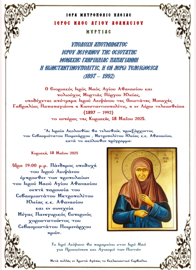 Ο Ενοριακός Ιερός Ναός Αγίου Αθανασίου και πολιούχος Μυρτιάς Πύργου Ηλείας, υποδέχεται απότμημα Ιερού Λειψάνου της Οσιοτάτης Μοναχής Γαβριηλίας Παπαπαγιάννη η Κωνσταντινοπολίτις, η εν Λέρω τελειωθείσα (1897-1992) το απόγευμα της Κυριακής 18 Μαΐου 2025.