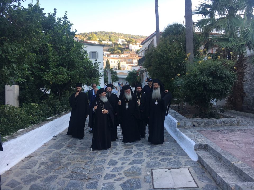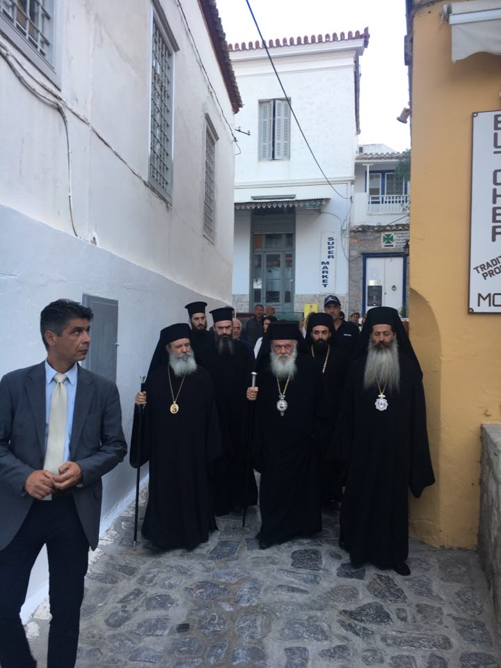 Ο Μητροπολίτης Υδρας καλωσόρισε τον Μακαριώτατο εκφράζοντας την χαρά του ίδιου και του ποιμνίου του για την παρουσία του στο ιστορικό αυτό μοναστήρι με αφορμή την εορτή της Κοιμήσεως της Θεοτόκου. Μίλησε για την εκκλησιαστική και εθνική ιστορία του νησιού, αλλά και στους τοπικούς Αγίους, όπως, επίσης, και για τους εθνικούς ήρωες. Αναφέρθηκε, ακόμη, στους άξιους, όπως τόνισε, συνεργάτες του Αρχιεπισκόπου, όπως είναι ο Επίσκοπος Θεσπιών, ενώ κάνοντας λόγο για τις κοινωνικές δομές της Αρχιεπισκοπής μίλησε για το Κέντρο Γεροντολογίας που εγκαινιάστηκε στις αρχές του καλοκαιριού.