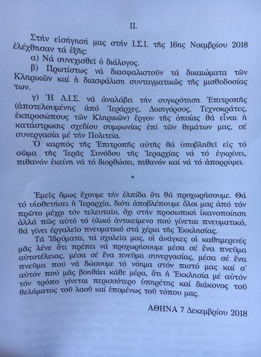 Ολοκληρώνοντας την συνάντησή του ο Αρχιεπίσκοπος με τον ΙΣΚΕ παρέδωσε στα μέλη του, υπόμνημα το οποίο διευκρινίζει, πως οποιαδήποτε απόφαση ληφθεί θα διασφαλίζει τα δικαιώματα του κλήρου κι εννοεί : (μισθοδοσία, ασφάλεια, συνταξιοδότηση, οργανικές θέσεις κλπ) και να κατοχυρωθεί και συνταγματικά η μισθοδοσία των κληρικών.