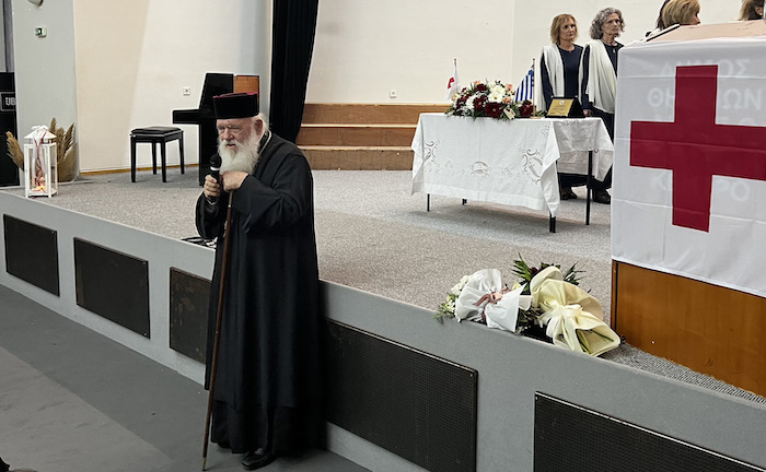 Στον χαιρετισμό του ο Αρχιεπίσκοπος ευχαρίστησε για την πρόσκληση και υπογράμμισε ότι παρά το δύσκολο πρόγραμμά του θέλησε πολύ να παρευρεθεί στην εν λόγω εκδήλωση και μίλησε για την σημαντική προσφορά του Ερυθρού Σταυρού. Παράλληλα, εξέφρασε την χαρά του για την τιμητική διάκριση της Χαρούλας Αλεξίου και συνεχάρη τους διοργανωτές και τους συντελεστές. Ολοκληρώνοντας τον χαιρετισμό του ο Αρχιεπίσκοπος θέλησε να στείλει ένα αισιόδοξο μήνυμα τονίζοντας: «Μην χάνουμε το θάρρος και την υπομονή μας. Τα προβλήματα τα καθημερινά να τα θεωρούμε σταθμό στην ζωή μας, διδασκαλία και συγχρόνως αφορμή για ένα νέο ξεκίνημα, Η πατρίδα μας περνάει δύσκολες ώρες. Είναι πολλά πράγματα που μας χωρίζουν, αλλά πρέπει να καλλιεργούμε ότι αυτά που μας χωρίζουν είναι λιγότερα από όσα μας ενώνουν». Και ευχήθηκε, «όλοι να προβληματιστούμε και να διαλέγουμε για την πατρίδα μας ό,τι είναι καλύτερο».