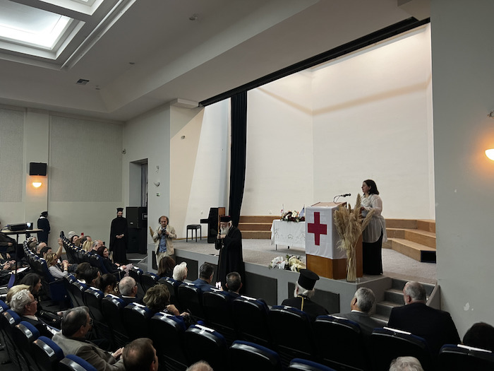 Ο Πρόεδρος τού Τμήματος Ερυθρού Σταυρού Θηβών κ. Θεόδωρος Ρουπάκας καλωσόρισε τον Αρχιεπίσκοπο και αναφέρθηκε στην ιστορία του Τμήματος, καθώς, επίσης, και στο έργο της Χαρούλας Αλεξίου.