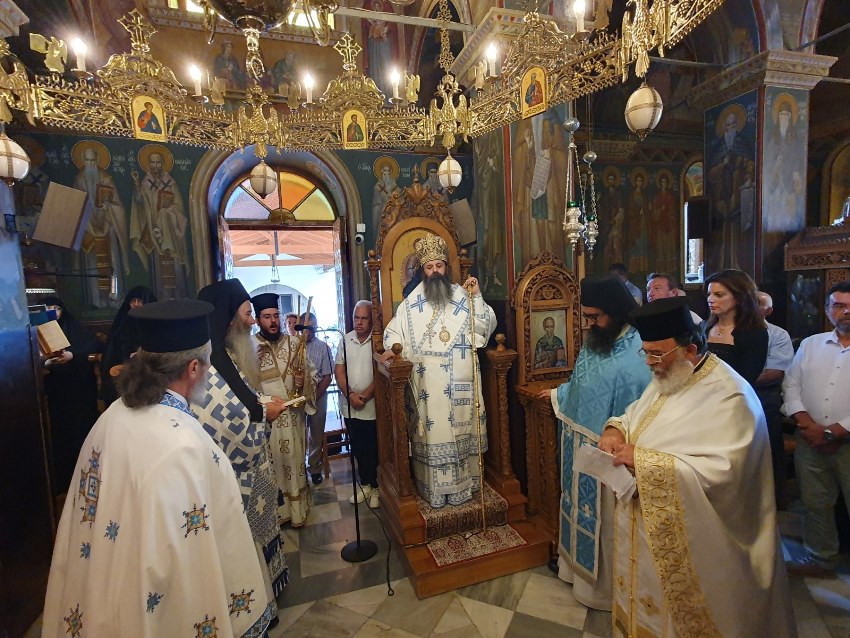 Ο Θεοφιλέστατος Πρωτοσύγκελλος της Ιεράς Μητροπόλεώς , Επίσκοπος Κεγχρεών κ. Αγάπιος στο κήρυγμά του αναφέρθηκε στην σχέση Θεοτόκου Μαρίας και Εκκλησίας, λαβών αφορμή από την Εικόνα της Κοιμήσεως της Παναγίας όπου εικονίζονται, στην πολυπρόσωπη αυτή παράσταση, Απόστολοι και Ιεράρχες συγκεντρωμένοι όχι γύρω από ένα επίγειο θυσιαστήριο αλλά γύρω από το «Θεοδόχο» σκήνος της Θεοτόκου, που υπήρξε μια άλλη επίγειος αλλ’ ουσιαστική «Κιβωτός της Διαθήκης», όπως η αρχική.
