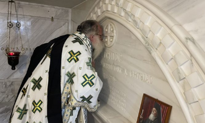 Ακολούθως ο κ. Κύριλλος, πλαισιούμενος από τον Ιερό Κλήρο, τέλεσε Τρισάγιο υπέρ αναπαύσεως της ψυχής των τριών μακαριστών προκατόχων του Μητροπολιτών Ευγενίου (Πολίτη), Φιλοθέου Α΄ (Μαζοκοπάκη), Φιλόθεου Β΄ (Βουζουνεράκη) των οποίων οι τάφοι βρίσκονται στην κρύπτη του ναού.