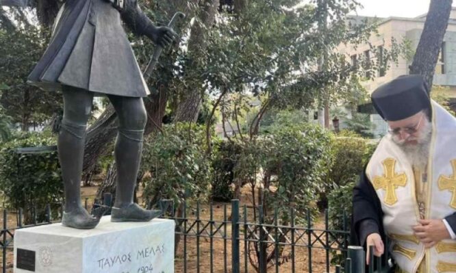 Κατόπιν ετελέσθη Τρισάγιο ενώπιον του αδριάντα του ήρωος Μακεδονομάχου Παύλου Μελά, που κοσμεί την πλατεία του Κεφαλαρίου. Τέλος πραγματοποιήθηκε κατάθεση στεφάνων τόσο από τον Σεβασμιώτατο, όσο και από άλλους φορείς, και εψάλη ο Εθνικός μας Ύμνος.