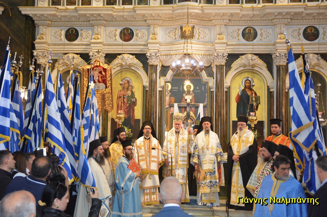 Μετά την οπισθάμβωνο ευχή διαβάστηκε το πρωτόκολλο των Ελευθερίων και έπειτα τελέσθηκε η επίσημη Δοξολογία. Μαθητές των σχολείων της πόλεως βρίσκονταν στο ναό υψώνοντας της Ελληνικές σημαίες. Το πανηγυρικό της ημέρας εκφώνησε ο Δήμαρχος της πόλεως κ. Ιωάννης Ζαμπούκης, δινοντας καίρια στοιχεία και σημασία στην πνευματική και οικονομική ανέλιξη της πόλεως.
