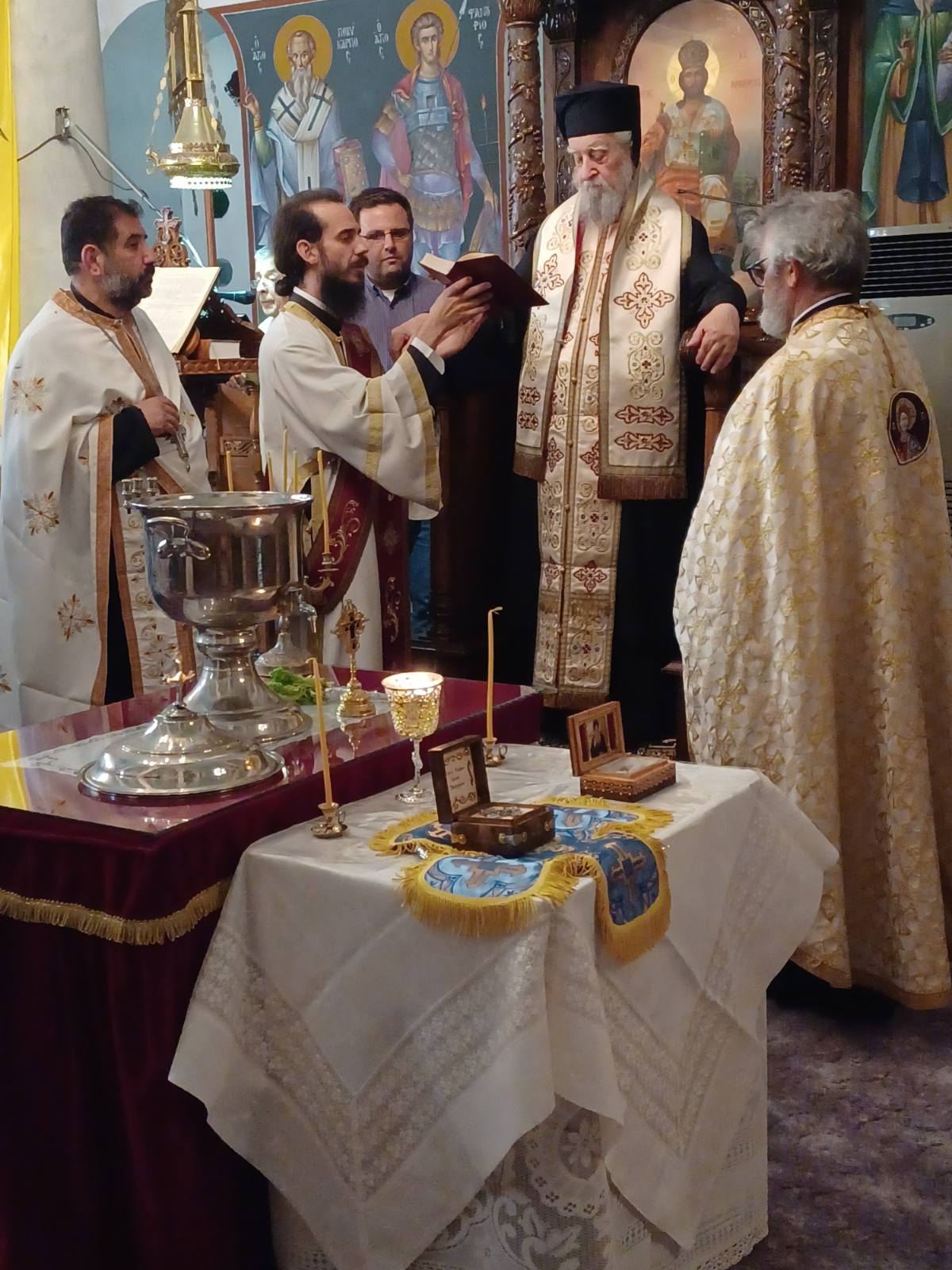 Μετά πέρας του εσπερινού ο Σεβασμιώτατος κ. Σεραφείμ ετέλεσε τον αγιασμό απευθύνοντας τις πατρικές και εόρτιες ευχές του προς τους πιστούς της ενορίας των Διρρευμάτων που τίμησαν την εορτή οι οποίοι είχαν την ευλογία να προσκυνήσουν τεμάχιο ιερού λειψάνου του συνεορτάζοντος Οσίου Δαβίδ του εν Ευβοίας το οποίο εκόμισε ο Σεβασμιώτατος κ. Σεραφείμ προς ευλογία και πνευματική ενίσχυση των πιστών.