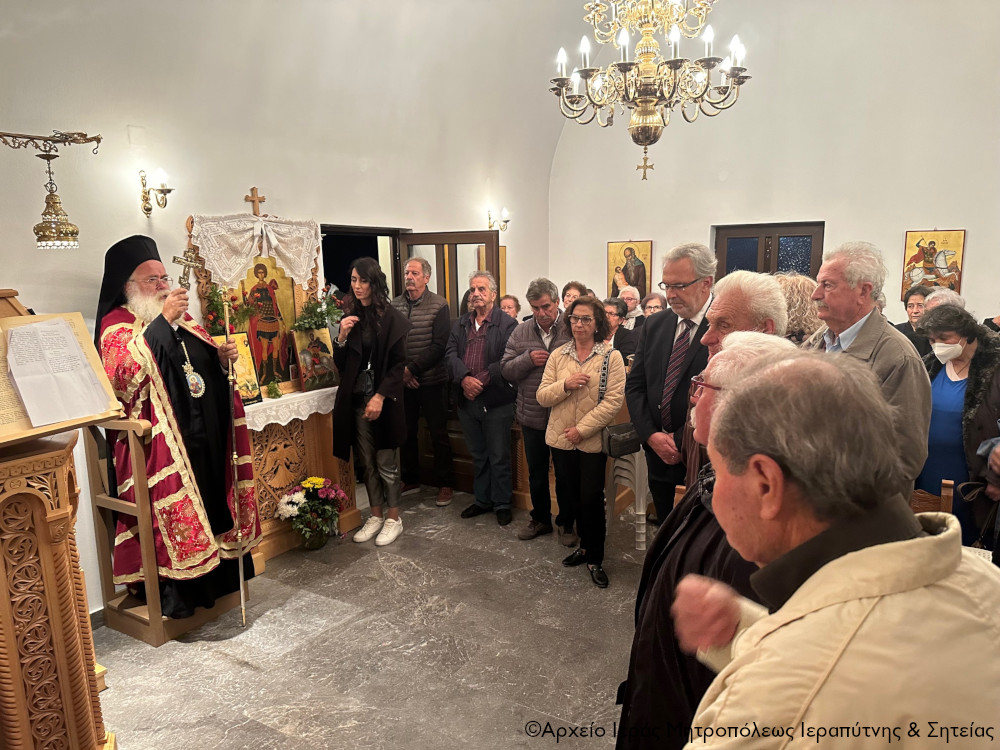 Στην ακολουθία χοροστάτησε ο Σεβ. Μητροπολίτης Ιεραπύτνης και Σητείας κ. Κύριλλος, ο οποίος κήρυξε επίκαιρα τον θείο λόγο και ευλόγησε τους προσφερόμενους άρτους αλλά και τα πρώτα κρασιά της νέας εσοδείας, που προσκόμισαν οι ευλαβείς και παραδοσιακοί κάτοικοι του ιστορικού οικισμού να ευλογηθούν κατά την παράδοση.