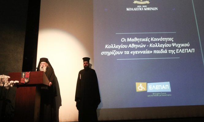 Στις αξίες της αλληλεγγύης και της υποστήριξης αναφέρθηκε ο Αρχιεπίσκοπος Αθηνών και πάσης Ελλάδος κ. Ιερώνυμος στο πλαίσιο του χαιρετισμού του στην εκδήλωση «Οι Μαθητικές Κοινότητες του Κολλεγίου Αθηνών-Κολλεγίου Ψυχικού στηρίζουν τα «γενναία» παιδιά της ΕΛΕΠΑΠ», η οποία πραγματοποιήθηκε σήμερα το πρωί στο Θέατρο του Κολλεγίου στο Ψυχικό.