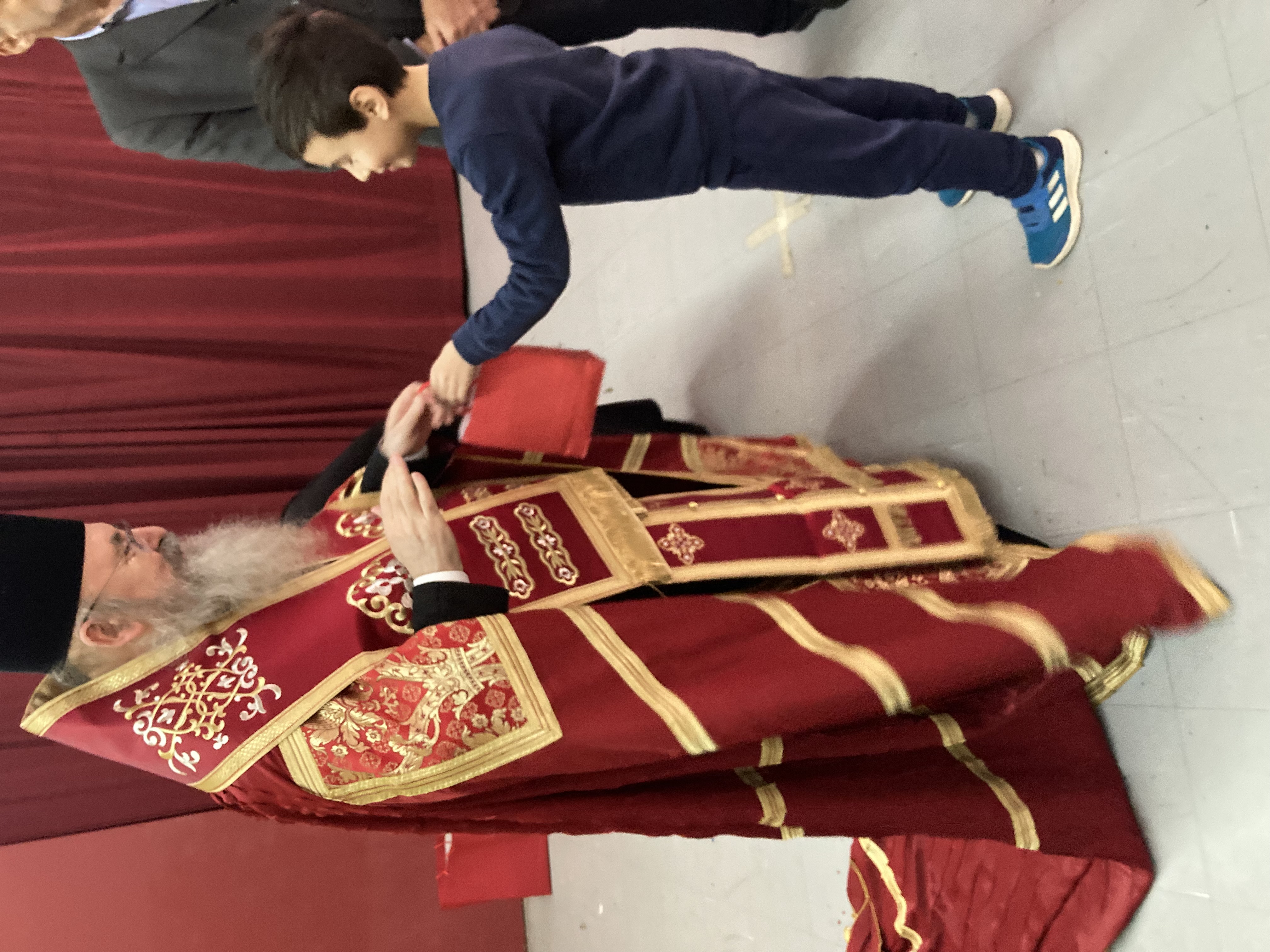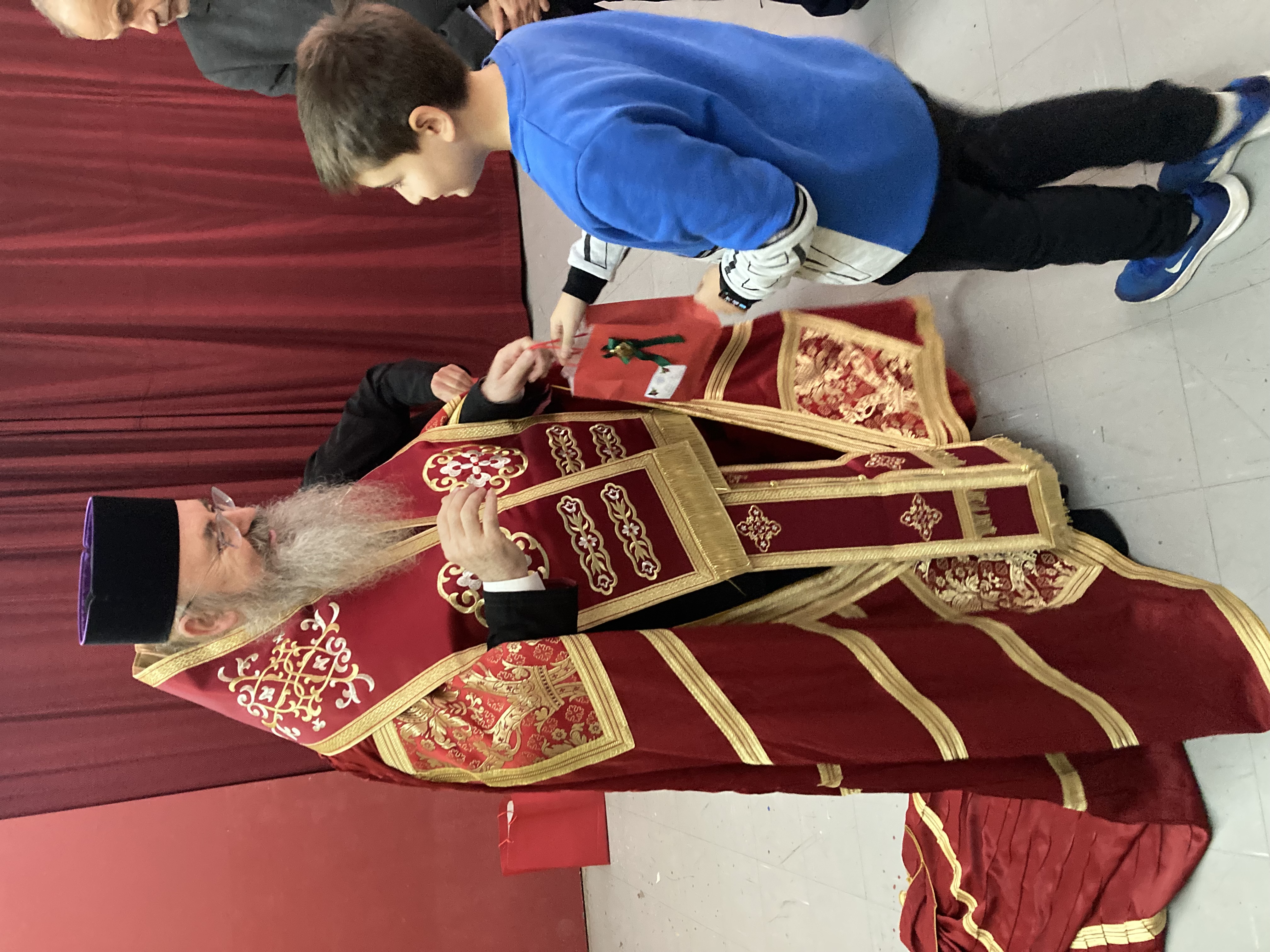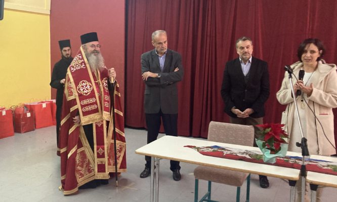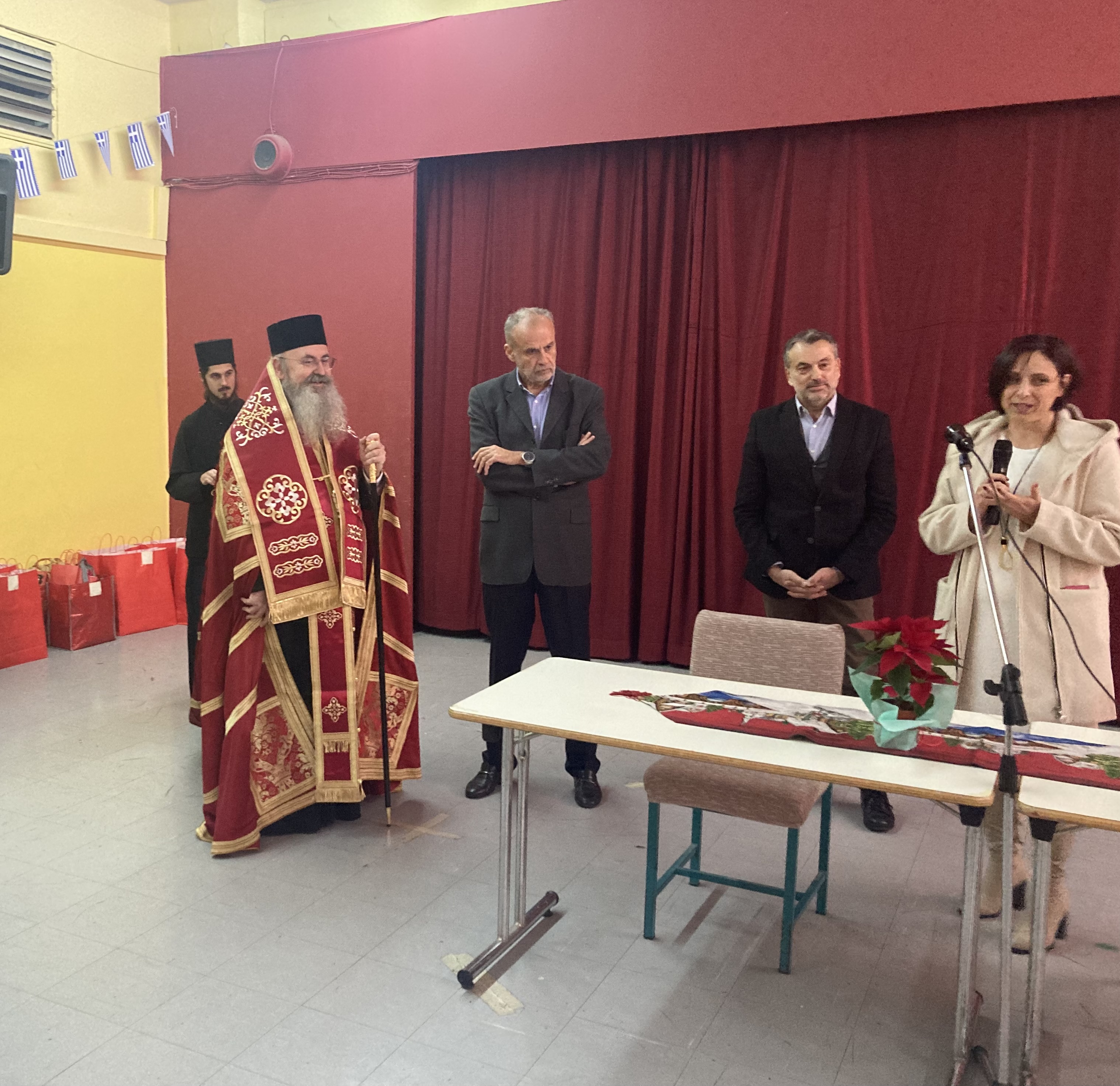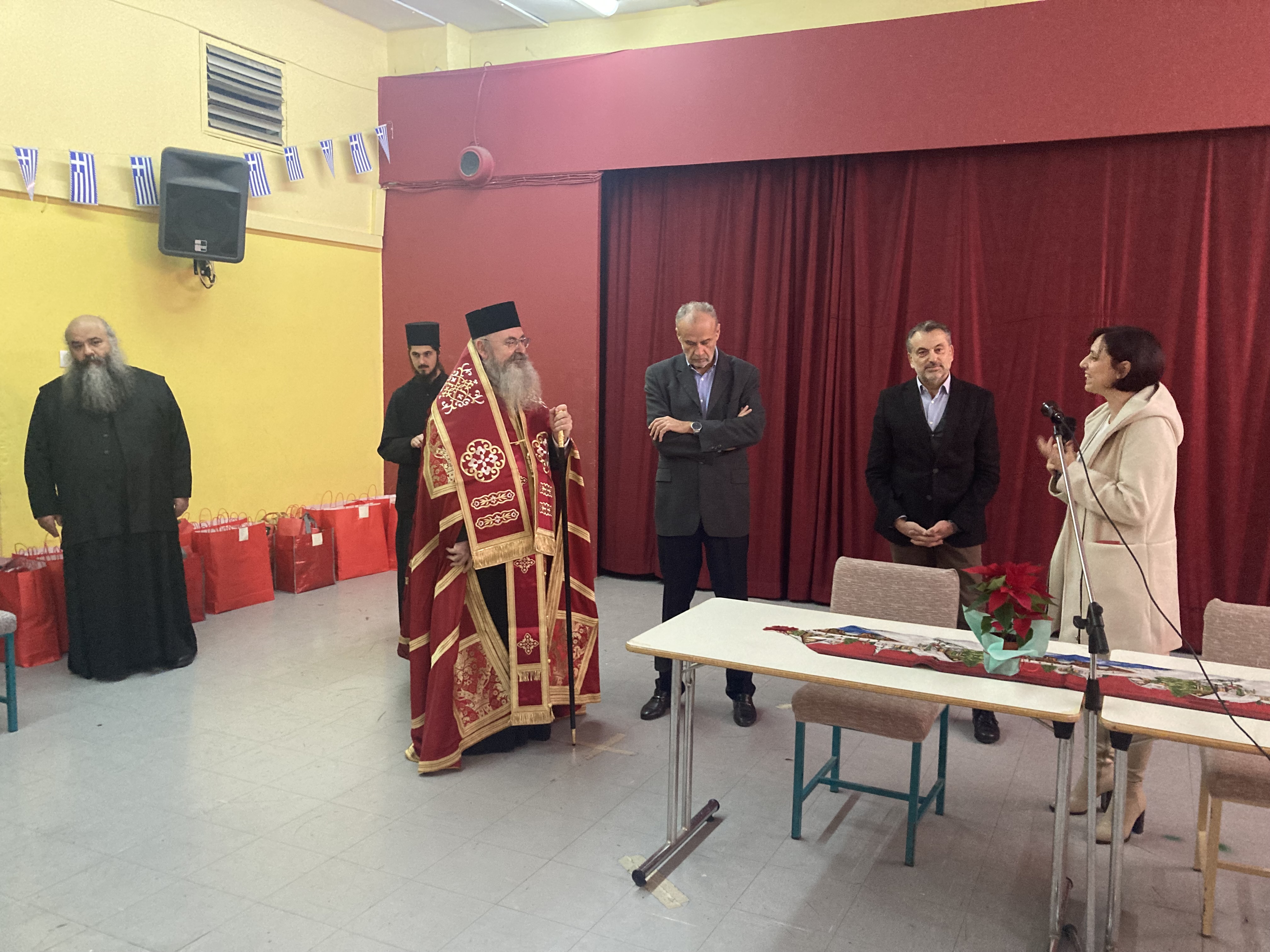 Ο Σεβασμιώτατος τέλεσε σύντομη δέηση κατά την οποία έψαλλαν χριστουγεννιάτικους ύμνους οι μαθητές των δύο σχολείων ενώ στην συνέχεια μοίρασε χριστουγεννιάτικα δώρα σε όλα τα παιδιά.