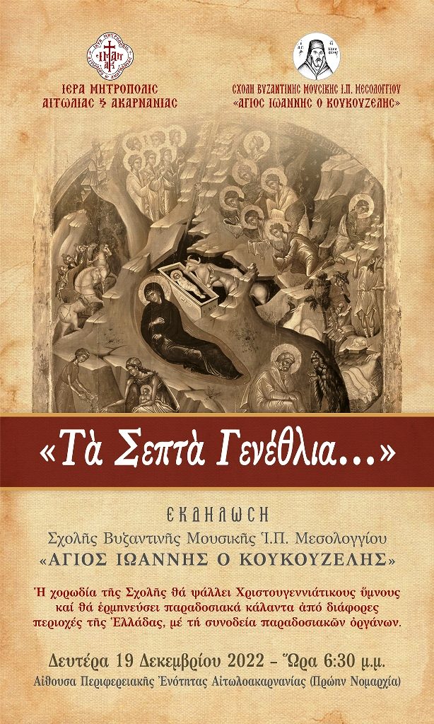 Η Σχολή Βυζαντινής Μουσικής Μεσολογγίου «Άγιος Ιωάννης ο Κουκουζέλης» της Ιεράς Μητροπόλεως Αιτωλίας και Ακαρνανίας διοργανώνει χριστουγεννιάτικη εορταστική εκδήλωση την Δευτέρα 19 Δεκεμβρίου 2022 και ώρα 18:30’ στην αίθουσα εκδηλώσεων της Περιφερειακής Ενότητας Αιτωλοακαρνανίας (πρώην Νομαρχία).