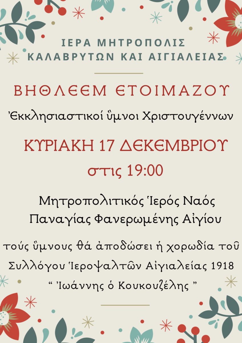 Η Ιερά Μητρόπολη Καλαβρύτων και Αιγιαλείας ενημερώνει τον ευλαβή λαό Της ότι, με αφορμή τις Εορτές της Θείας Επιφανείας, διοργανώνει την κεντρική χριστουγεννιάτικη εορταστική Εκδήλωση Αυτής, υπό τον τίτλο «Βηθλεέμ ετοιμάζου», η οποία θα πραγματοποιηθεί την Κυριακή 17 Δεκεμβρίου και ώρα 19.00, στον Μητροπολιτικό Ιερό Ναό Παναγίας Φανερωμένης Αιγίου.