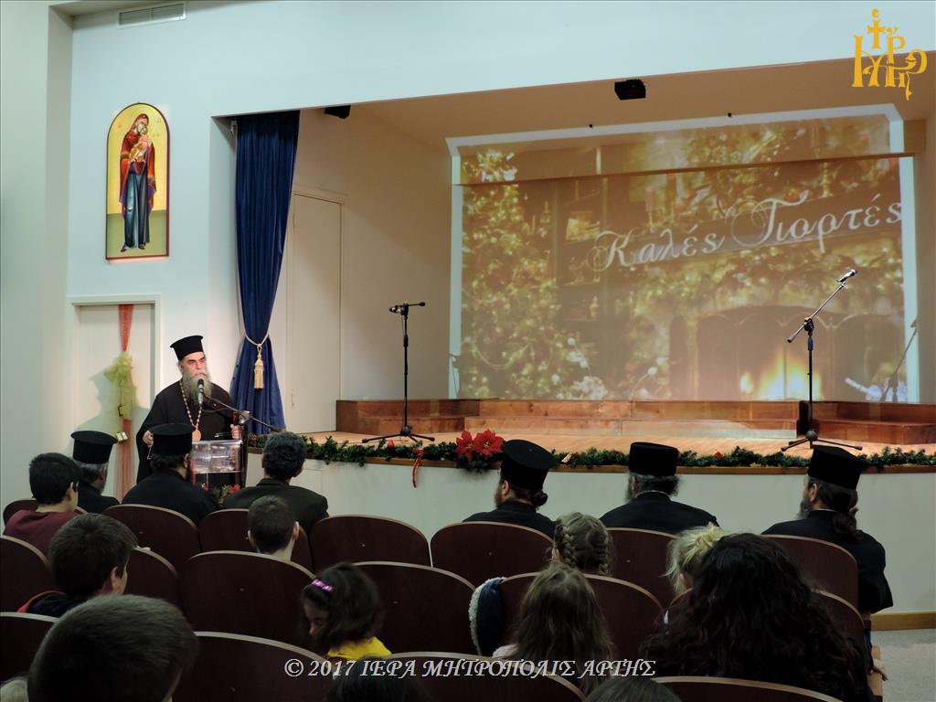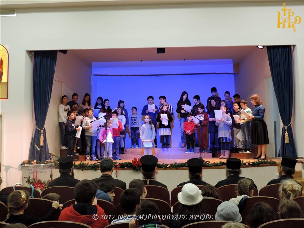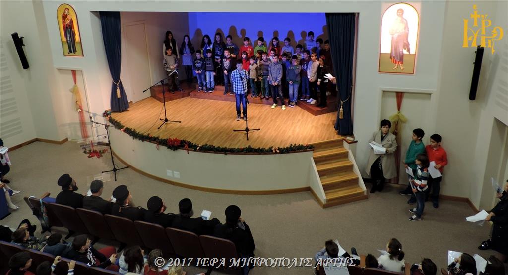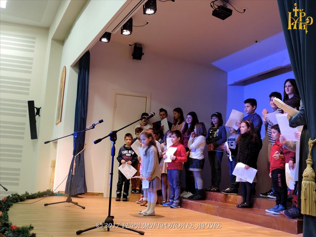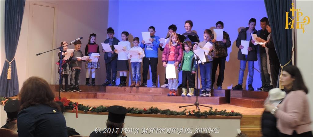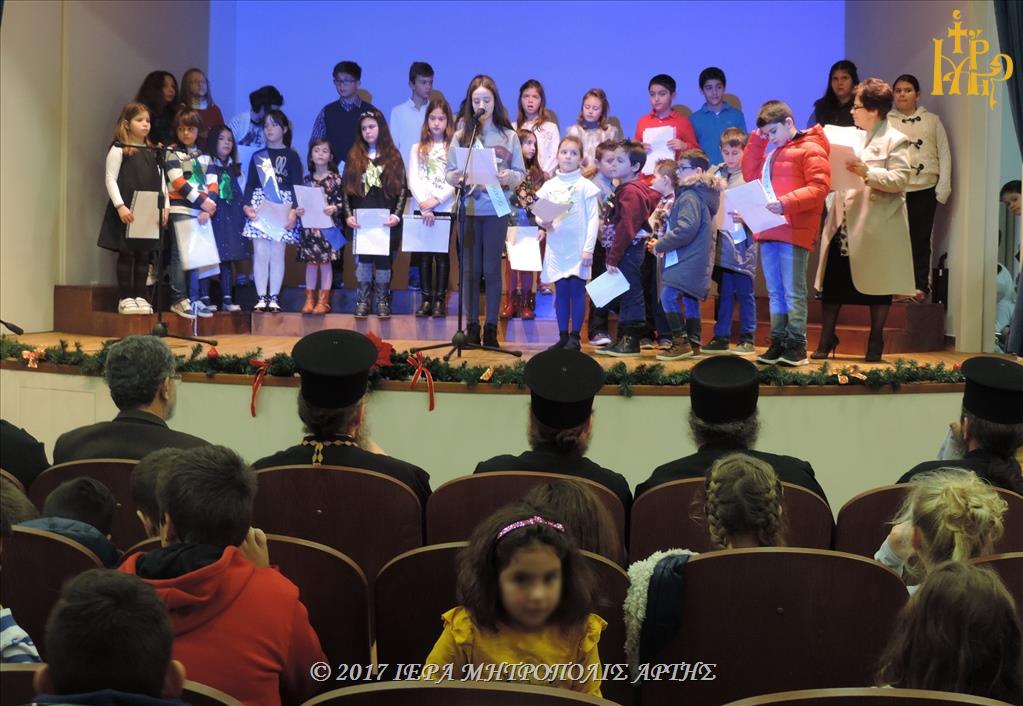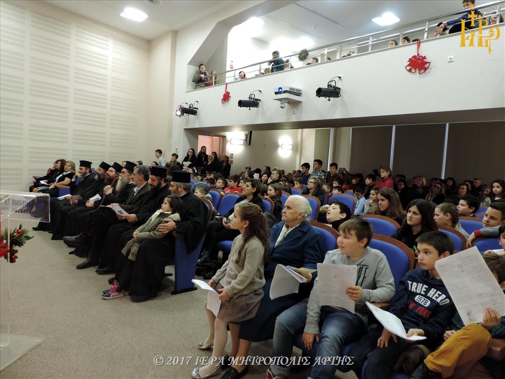 Το Σάββατο 16 Δεκεμβρίου 2017, το πρωΐ, πραγματοποιήθηκε η Χριστουγεννιάτικη γιορτή των Κατηχητικών σχολείων της πόλεως Άρτης, στην αίθουσα του Πνευματικού Κέντρου της Μητροπόλεως «Άγιος Ιωάννης ο Θεολόγος».
