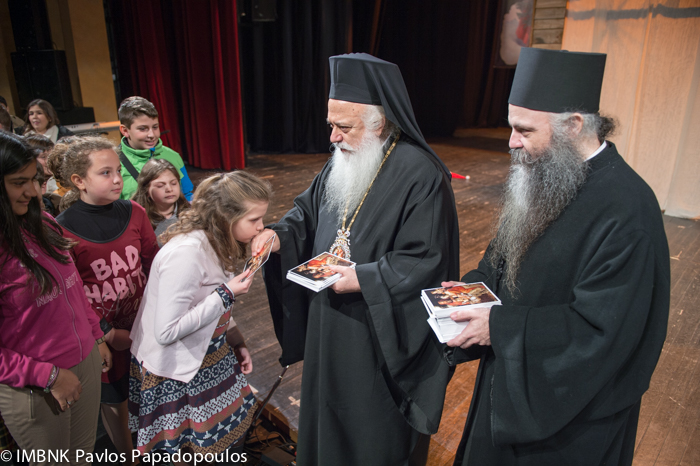 Στο τέλος της γιορτής ο Σεβασμιώτατος μαζί με τον υπεύθυνο του Γραφείου Νεότητας αρχιμ. Διονύσιο Ανθόπουλο, μοίρασε σε όλα τα παιδιά χριστουγεννιάτικα ενθύμια.