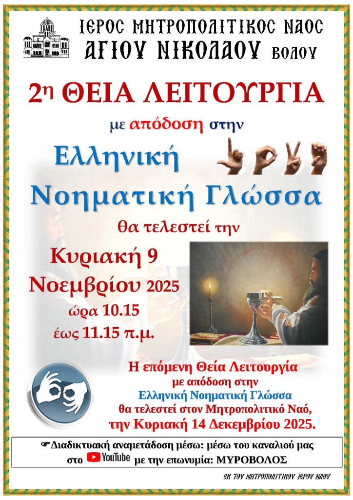 Η δεύτερη Θεία Λειτουργία, με ταυτόχρονη διερμηνεία στην νοηματική γλώσσα, θα τελεστεί την Κυριακή 9 Νοεμβρίου, στον Μητροπολιτικό Ιερό Ναό Αγίου Νικολάου Βόλου, από τις 10.15 έως τις 11.15 π.μ. Καλούνται οι αδελφοί μας, που αντιμετωπίζουν προβλήματα ακοής, να προσέλθουν στον Μητροπολιτικό Ναό του Βόλου, για να συμμετάσχουν, με τρόπο κατανοητό και εμπειρικό, στην Θεία Λειτουργία.