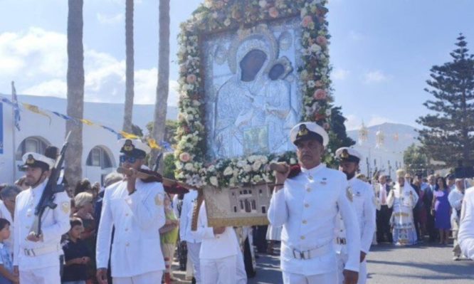Κατόπιν, ακολούθησε η περιφορά της Ιερής Εικόνας, καθώς πιστοί και προσκυνητές συνόδευσαν με ευλάβεια την Παναγία μέχρι το λιμάνι του νησιού, όπου τα πλοία υποδέχτηκαν, με τις κόρνες τους, την Ιερά Εικόνα του νησιού.