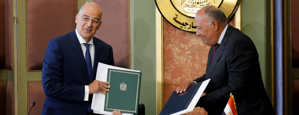 Επίσης, στην ανάρτησή του ο Νίκος Δένδιας παραθέτει φωτογραφία του με τον υπουργό Εξωτερικών της Αιγύπτου Σάμεχ Σούκρι από την υπογραφή της Συμφωνίας στις 6 Αυγούστου 2020, στο Κάιρο.