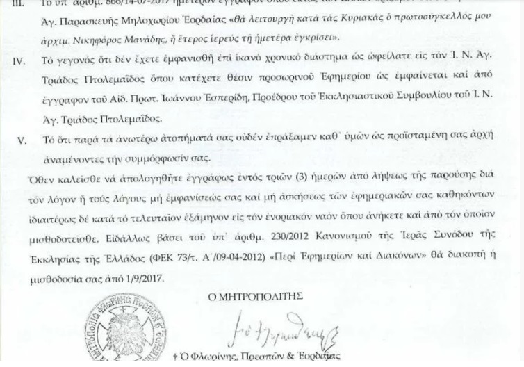 Ο Σεβασμιώτατος Μητροπολίτης Φλωρίνης Θεόκλητος ζητά από τον Ηγούμενο Ιγνάτιο να απολογηθεί, ειδάλλως θα σταματήσει τη μισθοδοσία.