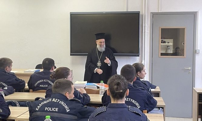 Ο Σεπτός μας Ποιμενάρχης μας είχε την ευκαιρία να επικοινωνήσει άμεσα με τους εκπαιδευόμενους, αναπτύσσοντας ζητήματα που άπτονται της πίστεως, της σύγχρονης κοινωνικής πραγματικότητας και των προκλήσεων που καλούνται να αντιμετωπίσουν οι νέοι άνθρωποι, ιδιαιτέρως μέσα στο πλαίσιο της αποστολής τους ως μελλοντικών στελεχών των Σωμάτων Ασφαλείας.