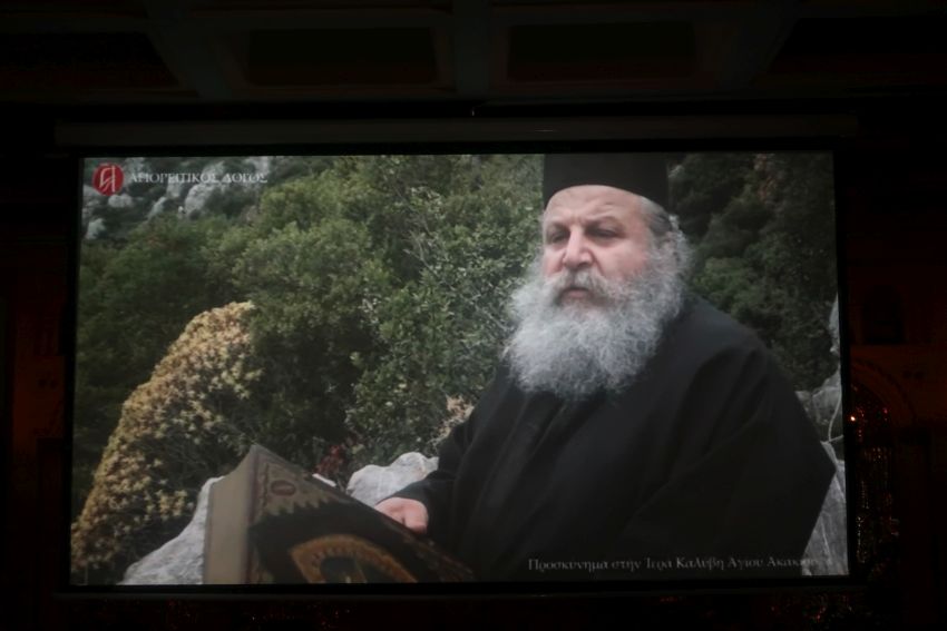 Πριν την έναρξη της ομιλίας του π. Παταπίου, προβλήθηκε μικρής διάρκειας ντοκιμαντέρ με τίτλο «Μυσταγωγία: Προσκύνημα στην Ιερά Καλύβη του Αγίου Ακακίου», όπου ασκείται πάνω από τριάντα χρόνια ο ομιλητής.