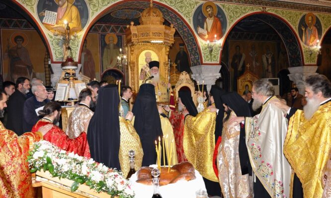 Ανήμερα της εορτής τελέστηκε πανηγυρική Θεία Λειτουργία, ιερουργούντος του Σεβ. Ποιμενάρχου μας κ. Ιγνατίου, το Πρωτοχρονιάτικο Μήνυμα του οποίου αναγνώσθηκε αντί κηρύγματος. Στο τέλος της Θείας Λειτουργίας ο Σεβ. Ποιμενάρχης μας ευχαρίστησε όλους για την παρουσία τους αναφέροντας ότι «είναι πάντοτε συγκινητικό την πρώτη ημέρα του νέου έτους να μας δίνεται η δυνατότητα αυτής της συλλειτουργίας. Θέλω να ευχηθώ σε όλους σας να είναι έτος ευλογημένο, με υγεία και δύναμη. Οι δυσκολίες θα έρθουν, αλλά από μας εξαρτάται να δίνουμε νόημα στον χρόνο με την κοινωνία του Χριστού και την κοινωνία μεταξύ μας….Αυτό είναι δώρο Θεού και όσοι βιώνουμε αυτή την αλήθεια ποτέ δεν απελπιζόμαστε ακόμα και αν έρθουν οι πιο δύσκολες στιγμές γιατί ξέρουμε ότι η δική μας ελπίδα έχει όνομα και λέγεται Χριστός. Η καινούργια χρονιά είναι ένα νέο βιβλίο στη ζωή του ανθρώπου, η κάθε ημέρα είναι μια σελίδα, από ένα βιβλίο το οποίο έχει 365 σελίδες, μακάρι η κάθε ημέρα αυτού του νέου έτους να είναι για τη ζωή μας, μια δοξολογία στον Θεό, εάν η κάθε ημέρα μας είναι μια ημέρα προσφοράς και αγάπης τότε έχει τη σφραγίδα του Θεού.»