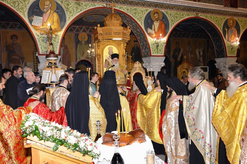 Στον Μέγα Πανηγυρικό Εσπερινό χοροστάτησε ο Σεβ. Μητροπολίτης Δημητριάδος κ. Ιγνάτιος, παρουσία πλειάδος Κληρικών και μεγάλου πλήθους πιστών. Τον Θείο Λόγο Κήρυξε ο Πρωτ. Θεμιστοκλής Μουρτζανός, Γενικός Αρχιερατικός Επίτροπος της Ιεράς Μητροπόλεως Κερκύρας, Παξών & Διαποντίων Νήσων. Αμέσως μετά, στο Πν. Κέντρο του Ναού, ο Σεβασμιώτατος ευλόγησε την Βασιλόπιτα της Ενορίας.