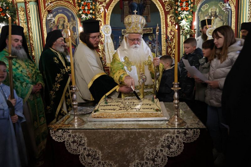 Στο τέλος της Θείας Λειτουργίας ο Σεβασμιώτατος ευλόγησε την Βασιλόπιτα της Αρχιερατικής Περιφέρειας Αγιάς και ακολούθησε η λιτάνευση της ιεράς Εικόνος των εορταζομένων Αγίων στους δρόμους της πόλης.