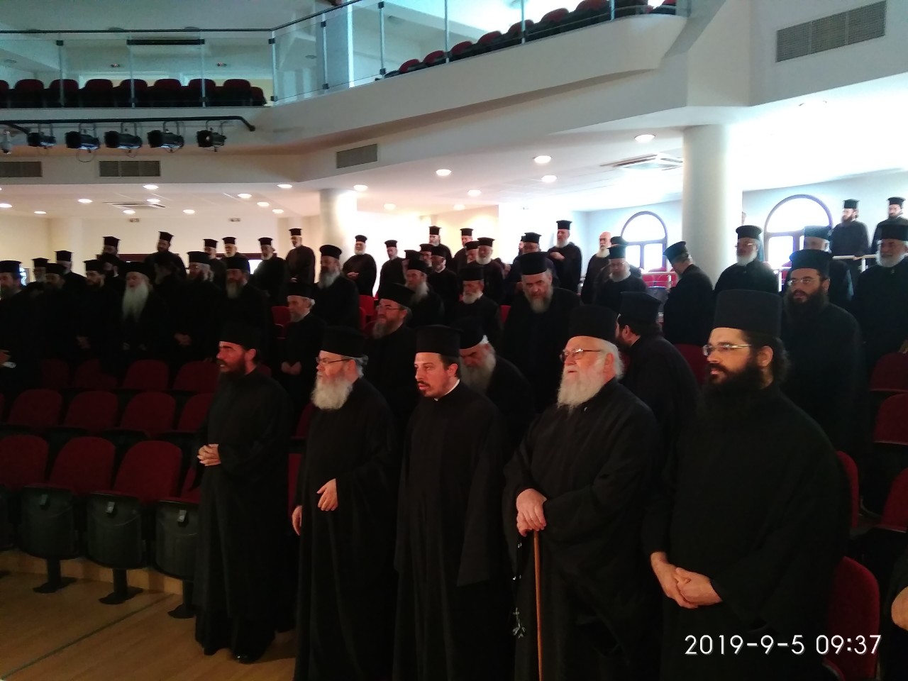 «Αγαπητοί και σεβαστοί μου Πατέρες καλή σας ημέρα και καλή και ευλογημένη Εκκλησιαστική χρονιά. Δεν χρειάζεται να εξηγήσω το λόγο για τον οποίο εγώ βρίσκομαι σε αυτή τη θέση, όλοι γνωρίζετε τα γεγονότα, τα βιώσαμε μαζί πριν 40 ημέρες και επέλεξα να κάνουμε αυτό το Ιερατικό Συνέδριο εν όψει της νέας Εκκλησιαστικής χρονιάς για να έχω την ευκαιρία να σας δω όλους μαζί στα πλαίσια της Τοποτηρητείας μου.