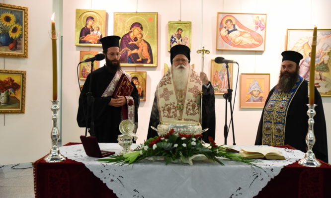 Τον αγιασμό ενάρξεως των μαθημάτων της Σχολής Αγιογραφίας «Διά χειρός» για τη νέα εκπαιδευτική χρονιά τέλεσε o Σεβασμιώτατος Ποιμενάρχης μας κ.κ. Ιγνάτιος, παρουσία τοπικών αρχών, του Πρωτοσυγκέλλου της Ι.Μ.Δ. Αρχιμανδρίτου π. Δαμασκηνού Κιαμέτη, του Αρχιερατικού Επιτρόπου, π. Μάξιμου Παπαϊωάννου, πολλών ιερέων, του ιδιοκτήτη της Γκαλερί δ. Αθανασίου Δουλκέρογλου, που είχε πραγματοποιήσει επίσης Αναδρομική Έκθεση του τιμώμενου Αγιογράφου την περασμένη Πασχαλιά του 2022, μαθητών της Σχολής, φίλων του Ζαχαρία Καραφέργια και φιλότεχνου κοινού.