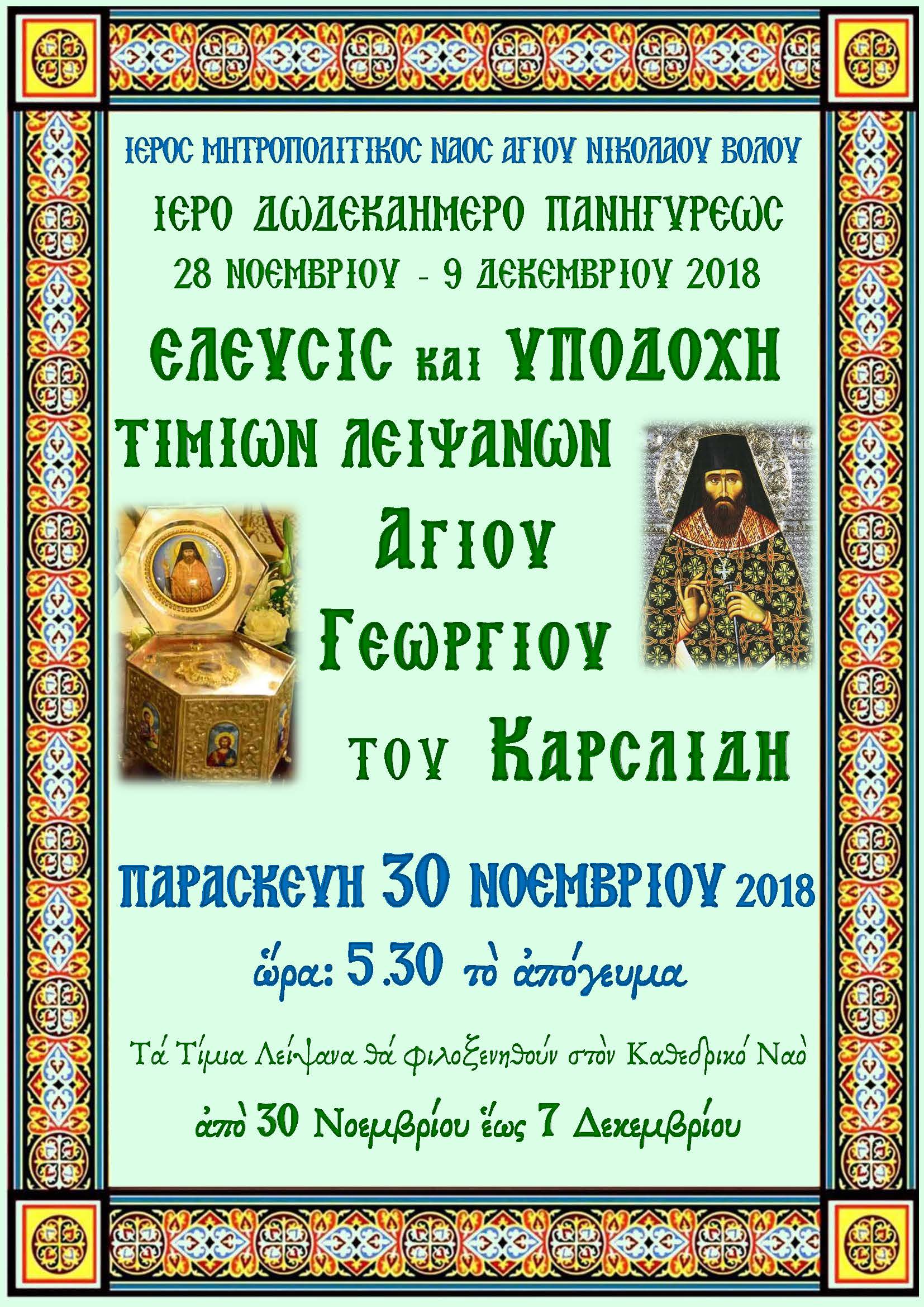 Κορυφαία θέση τις ημέρες αυτές κατέχει η έλευση στον Βόλο τεμαχίου του Ιερού Λειψάνου του νεοφανούς Οσίου Γεωργίου Καρσλίδου, του Ομολογητού, το οποίο φυλάσσεται στην Ιερά Μονή Αναλήψεως του Κυρίου Δράμας, γεγονός που συνιστά εξαιρετική τιμή και ευλογία για την Τοπική μας Εκκλησία και τον λαό της περιοχής μας συνιστά.