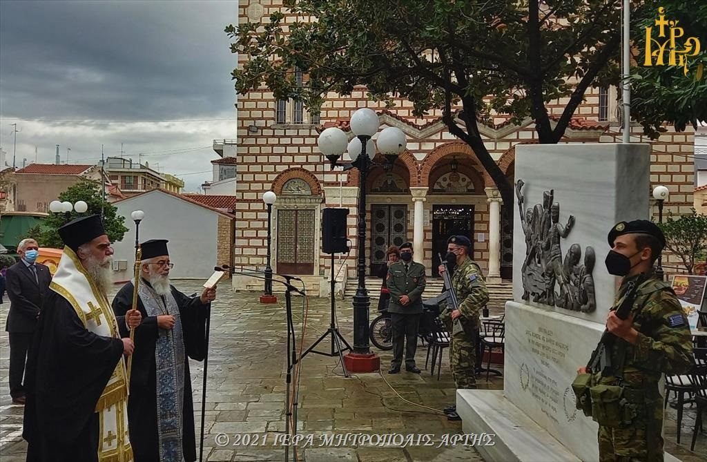 Στην συνέχεια, στο μνημείο της Εθνικής Αντίστασης, το ευρισκόμενο έξω ακριβώς απο τον Μητροπολιτικό Ναό του Αγίου Δημητρίου, πραγματοποιήθηκε επιμνημόσυνη δέηση και κατάθεση στεφάνων. Παρέστησαν εκπρόσωποι Αρχών και Φορέων.
