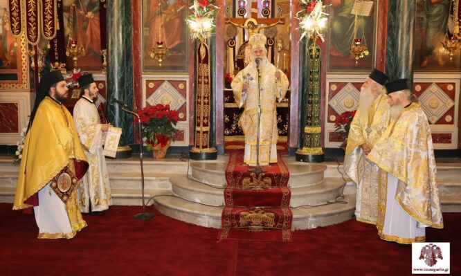 Στην ομιλία του ο σεπτός Ποιμενάρχης μας αναφέρθηκε στην μακροθυμία του Πανάγαθου Θεού απέναντι στις αμαρτίες μας, αλλά και στην ανάγκη το νέο έτος κάθε χριστιανός, αφού κάνει έναν ειλικρινή και βασανιστικό πνευματικό απολογισμό, να προσπαθήσει  να κάνει έστω ένα μικρό βήμα προς τον Τριαδικό Θεό μας καταπολεμώντας τις αδυναμίες του και εστιάζοντας στην προσευχή, τη μετάνοια και την θυσιαστική αγάπη προς τον συνάνθρωπο. Ολοκληρώνοντας, ευχήθηκε στους τοπικούς άρχοντες και το λοιπό εκκλησίασμα σωματική και ψυχική υγεία, γαλήνη, χαρά και κατά Θεόν προκοπή.