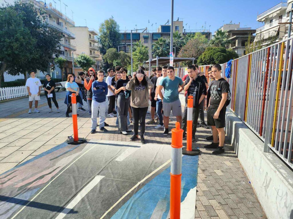 Στη συνέχεια οι μαθητές και οι μαθήτριες μετέβησαν στην πλατεία Θεμιστοκλή στον Πειραιά όπου πραγματοποιήθηκε βιωματική δράση οδικής ασφάλειας. Δοκίμασαν τους προσομοιωτές ατυχήματος και με ειδικά γυαλιά αντιλήφθηκαν πώς συμπεριφέρεται ο οδηγός υπό συνθήκες κατανάλωσης αλκοόλ όπως επίσης και τη σημασία της ασφαλούς οδήγησης οδηγώντας εντός ορίων ταχύτητας και φορώντας πάντα ζώνη ασφαλείας.