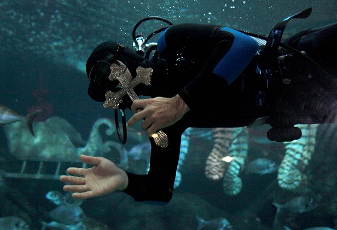 Ένας δύτης βούτηξε για να πιάσει τον σταυρό και να λάβει την ευλογία του. Οι παριστάμενοι τον επευφήμησαν όταν ανέσυρε τον σταυρό κι έλαβε την ευχή του Αρχιεπισκόπου Κρήτης.