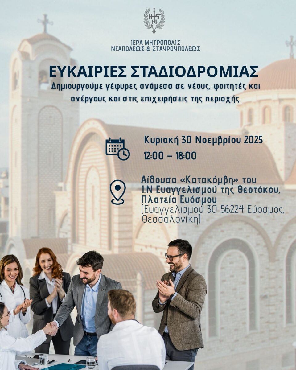 Ο Σεβασμιώτατος Μητροπολίτης της Ιεράς Μητροπόλεως Νεαπόλεως και Σταυρουπόλεως, κ.κ. Βαρνάβας, μας προσκαλεί να συμμετέχουμε στην εκδήλωση με τίτλο «Ευκαιρίες Σταδιοδρομίας» που θα διοργανώσει η Ιερά Μητρόπολις Νεαπόλεως και