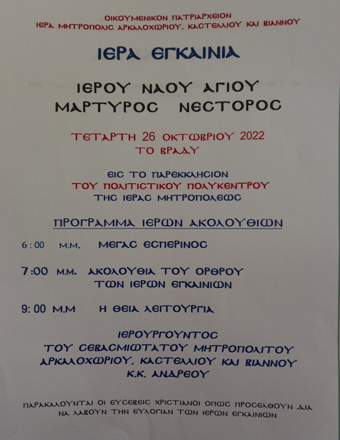 Τα Εγκαίνια του Ι. Ναού του Αγίου Νέστορος, στη Μητρόπολη Αρκαλοχωρίου, θα τελεστούν την Τετάρτη και Πέμπτη, 26 και 27 Οκτωβρίου 2022, σύμφωνα με το ακόλουθο Πρόγραμμα: