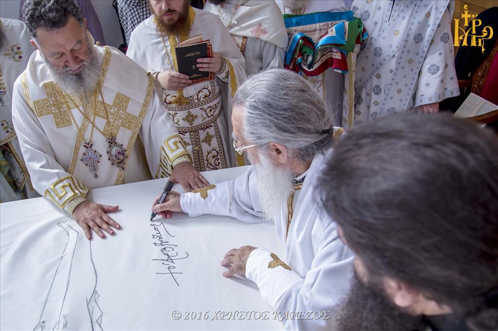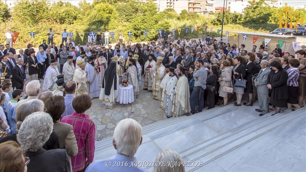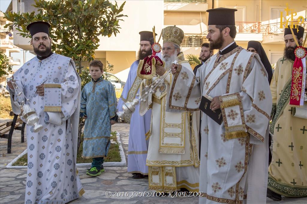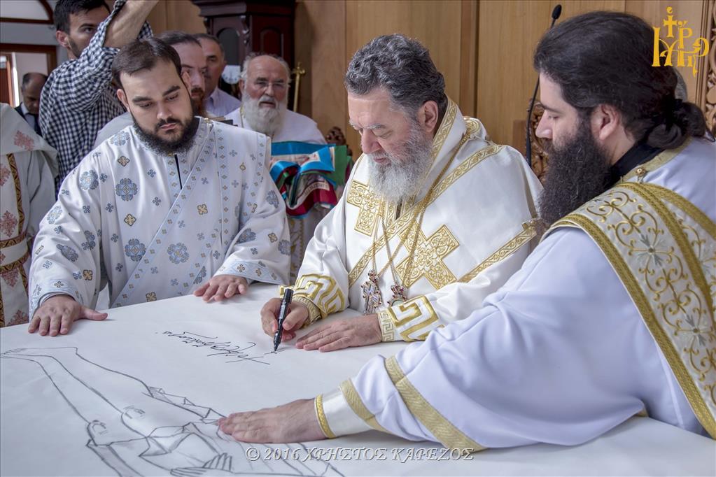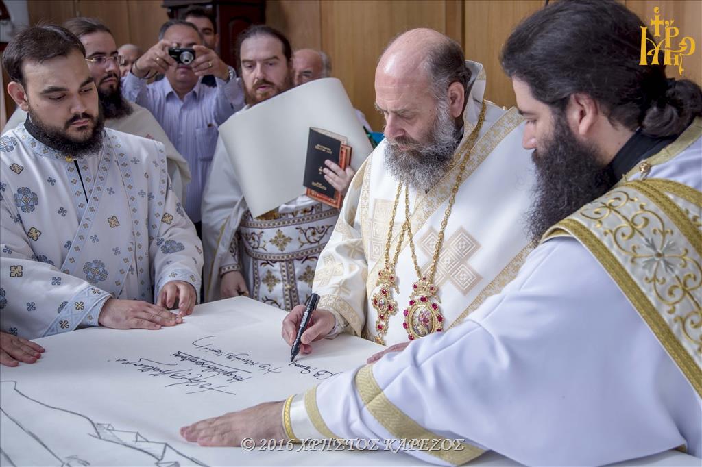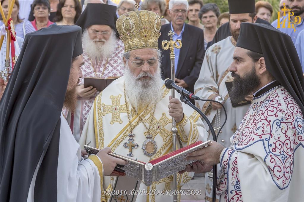 Ανταπαντώντας ο Σεβασμιώτατος Ποιμενάρχης μας, συνεχάρη τον π.Νικόλαο καθώς και όλα τα Μέλη του Εκκλησιαστικού Συμβουλίου για την αποπεράτωση των εργασιών καθώς και για την άρτια οργάνωση και προετοιμασία των Εγκαινίων, τους προσκεκλημένους Αρχιερείς για την ευγενική ανταπόκρισή τους να είναι συνευφραινόμενοι της μεγάλης εορτής και πανηγύρεως της τοπική μας Εκκλησίας, τους τοπικούς Άρχοντες και εκπροσώπους του Στρατού και των Σωμάτων Ασφαλείας οι οποίοι μαζί με τον ευσεβή λαό προσέφεραν Δοξολογία στον Πανάγαθο Θεό. Επισφραγίζοντας δε την λαμπρή τελετή των Εγκαινίων αποκάλυψε την κτητορική επιγραφή επί της εισόδου του Ιερού Ναού.