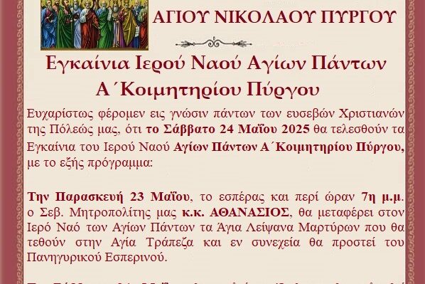 Την Παρασκευή 23 Μαΐου, το εσπέρας και περί ώραν 7η μ.μ. ο Σεβ. Μητροπολίτης Ηλείας και Ωλένης κ.κ. ΑΘΑΝΑΣΙΟΣ, θα μεταφέρει στον Ιερό Ναό των Αγίων Πάντων τα Άγια Λείψανα Μαρτύρων που θα τεθούν στην Αγία Τράπεζα και εν συνεχεία θα προστή του Πανηγυρικού Εσπερινού.