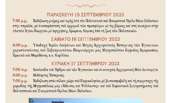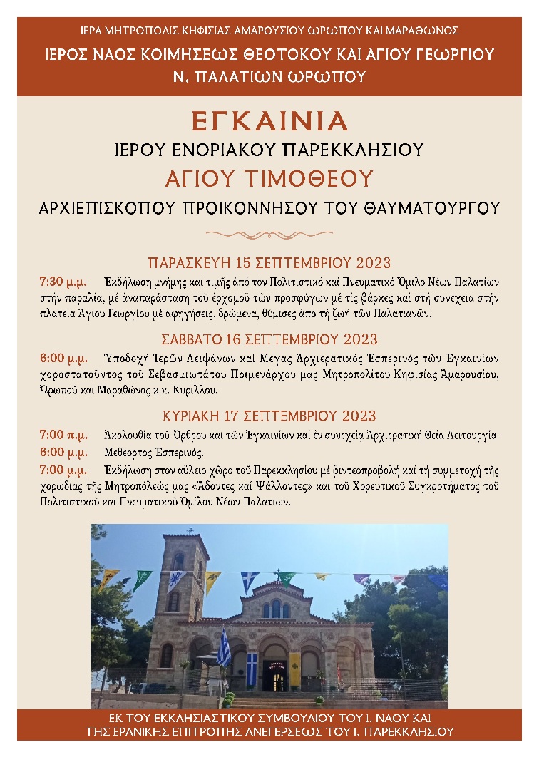 Τα Εγκαίνια του Ιερού Ναού Αγίου Τιμοθἐου Προικοννήσου Ν. Παλατίων Ωρωπού, θα τελεσθούν, στη Μητρόπολη Κηφισίας, σύμφωνα με υο ακόλουθο Πρόγραμμα:
