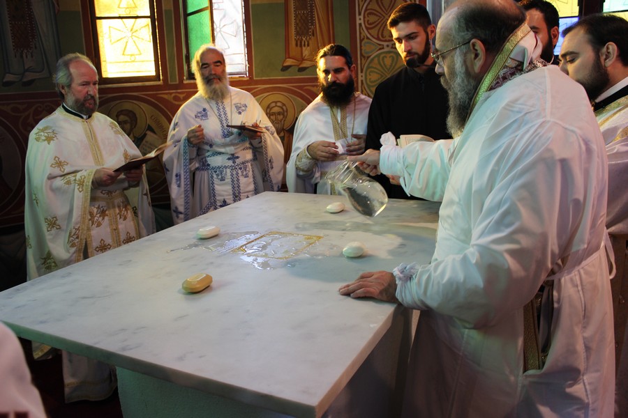 Η καθιέρωση της Αγίας Τραπέζης έγινε δια των λειψάνων των αγίων Μαρτύρων των Οσιάθλων των εν Ταώ της Πεντέλης αναιρεθέντων, των εν τη Ιερά Μονή του Αγίου Σάββα και των εν τη Ιερά Μονή του Οσίου Θεοδοσίου του Κοινοβιάρχου.