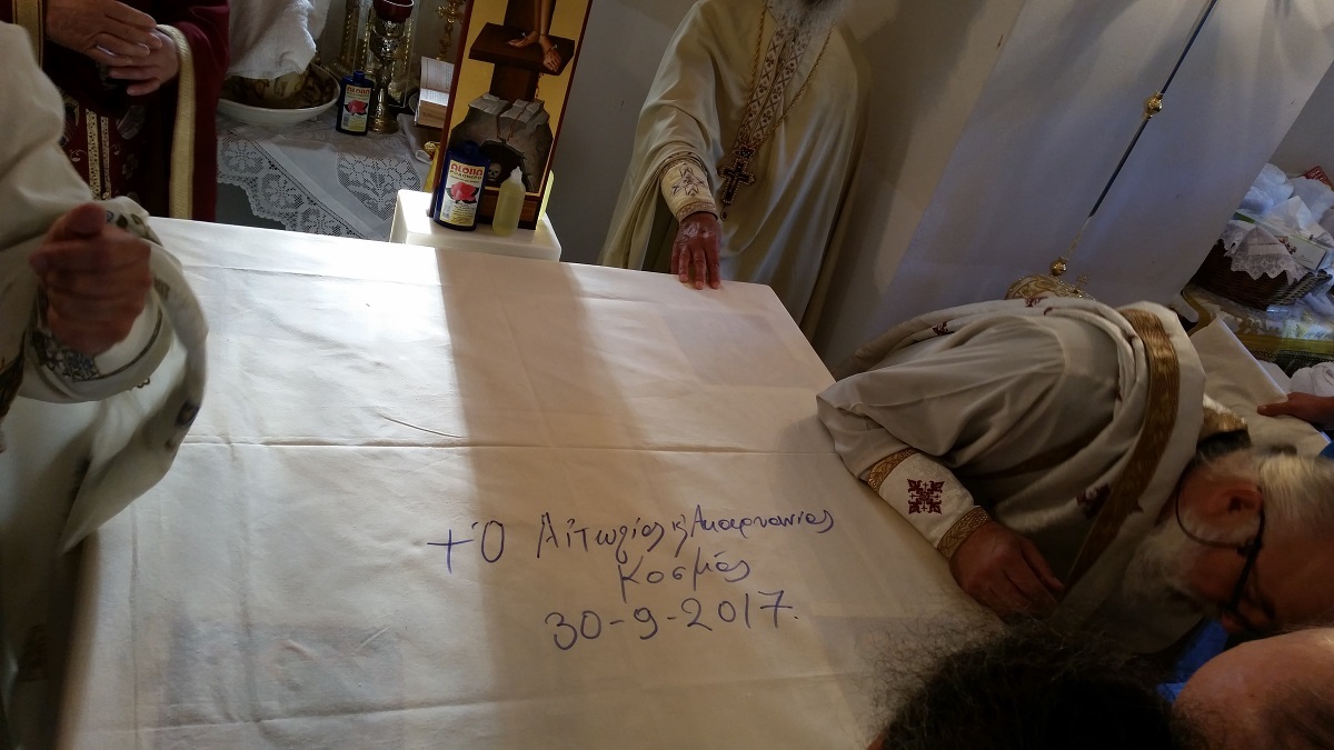 Ο Σεβασμιώτατος Μητροπολίτης Αιτωλίας και Ακαρνανίας κ. Κοσμάς προεξήρχε κατά τις ακολουθίες του Όρθρου και των Εγκαινίων, ενώ τέλεσε την πρώτη Θεία Λειτουργία στην εγκαινιασθείσα Αγία Τράπεζα.