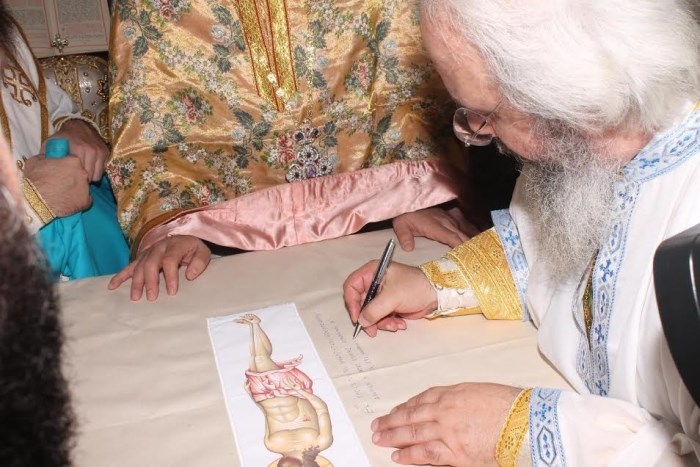 Στον κατάμεστο ναό της αγίας Βαρβάρας, οι παρευρισκόμενοι πιστοί παρακολουθούσαν την τελετή των εγκαινίων από γιγαντοοθόνη που είχε στηθεί στο σολέα του ναού, εξαιτίας της στενότητας του χώρου στην κρύπτη.