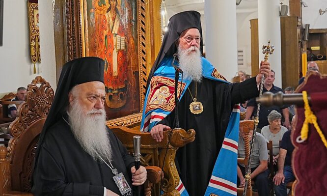 Ἀπόψε ὅμως εἴχαμε τή χαρά νά τά ψάλουμε ἔχοντας στόν ναό μας χοροστατοῦντα ἕναν ἐκλεκτό ἱεράρχη τοῦ Οἰκουμενικοῦ μας Πατριαρχείου καί Διευθυντή τοῦ Γραφείου του στήν Ἀθήνα, μέ τόν ὁποῖο συνδεόμεθα ἀπό τά νεανικά μας χρόνια μέ ἀδελφική φιλία καί διακονήσαμε μαζί στή Μεγάλη Βρετανία πρίν ἀπό πολλά χρόνια. Εἶναι ὁ Σεβασμιώτατος καί πολυσέβαστος Μητροπολίτης Λαοδικείας κ. Θεοδώρητος, ὁ ὁποῖος πάντοτε καί μέ πολλή ἀγάπη ἀνταποκρίνεται στίς προσκλήσεις μας, καί βρίσκεται καί αὐτές τίς ἡμέρες στήν Ἱερά μας Μητρόπολη γιά νά συνεορτάσει μαζί μας τήν ἑορτή τῆς Κοιμήσεως τῆς Θεοτόκου.
