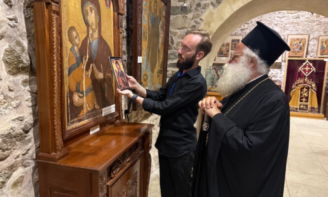 Στον σύντομο χαιρετισμό του ο Σεβ. Μητροπολίτης Ιεραπύτνης και Σητείας κ. Κύριλλος ευχαρίστησε τον Ηγούμενο της Μονής Αρχιμ. Αμβρόσιο Σκαρβέλη, διότι με το άνοιγμα της ιστορικής Μονής και των λατρευτικών κειμηλίων της στον έξω κόσμο ενσαρκώνει το όραμα της Ορθόδοξης Εκκλησίας, η οποία σέβεται τα επιτεύγματα της σύγχρονης επιστήμης και της τεχνολογίας και τα θέτει στην υπηρεσία του πιστού ανθρώπου, που ψάχνει να βρει και να προσεγγίσει τον Θεό, ακόμη και στην εποχή της ψηφιακής μετάβασης και της τεχνικής νοημοσύνης. Ευχαρίστησε την Εφορεία Αρχαιοτήτων Λασιθίου που πρότεινε το καστρομονάστηρο του Τοπλού για να υλοποιηθεί αυτή η δράση και συνεχάρη τους συντελεστές της δράσης κ. Ζιάρα και Καλαϊτζόγλου για την δράση τους που ενώνει την παράδοση, την χριστιανική τέχνη και τον πολιτισμό με τις ψηφιακές τεχνολογίες. Τέλος καλωσόρισε τους ελλογιμωτάτους κ. Καθηγητές της Θεολογικής Σχολής του ΕΚΠΑ για την παρουσία και τον σύγχρονο θεολογικό λόγο τους.