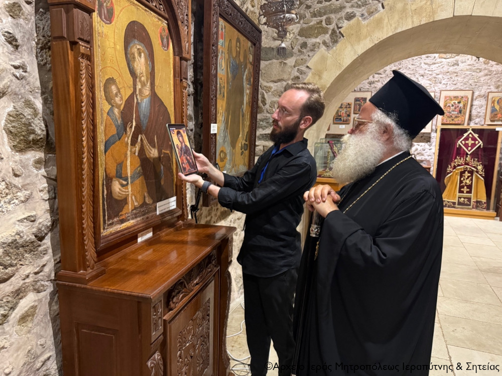 Στον σύντομο χαιρετισμό του ο Σεβ. Μητροπολίτης Ιεραπύτνης και Σητείας κ. Κύριλλος ευχαρίστησε τον Ηγούμενο της Μονής Αρχιμ. Αμβρόσιο Σκαρβέλη, διότι με το άνοιγμα της ιστορικής Μονής και των λατρευτικών κειμηλίων της στον έξω κόσμο ενσαρκώνει το όραμα της Ορθόδοξης Εκκλησίας, η οποία σέβεται τα επιτεύγματα της σύγχρονης επιστήμης και της τεχνολογίας και τα θέτει στην υπηρεσία του πιστού ανθρώπου, που ψάχνει να βρει και να προσεγγίσει τον Θεό, ακόμη και στην εποχή της ψηφιακής μετάβασης και της τεχνικής νοημοσύνης. Ευχαρίστησε την Εφορεία Αρχαιοτήτων Λασιθίου που πρότεινε το καστρομονάστηρο του Τοπλού για να υλοποιηθεί αυτή η δράση και συνεχάρη τους συντελεστές της δράσης κ. Ζιάρα και Καλαϊτζόγλου για την δράση τους που ενώνει την παράδοση, την χριστιανική τέχνη και τον πολιτισμό με τις ψηφιακές τεχνολογίες. Τέλος καλωσόρισε τους ελλογιμωτάτους κ. Καθηγητές της Θεολογικής Σχολής του ΕΚΠΑ για την παρουσία και τον σύγχρονο θεολογικό λόγο τους.